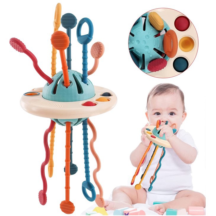 2. Montessori ufo silicone puxando brinquedo como brinquedos educativos para crianças com mais de um ano de idade, brinquedos de viagem para crianças com mais de um ano de idade, brinquedos de desenvolvimento para bebês, brinquedos infantis para viagens de avião; brinquedos infantis de viagem para aviões e brinquedos Montessori para bebês entre seis e doze meses. O brinquedo sensorial é portátil e o companheiro ideal para o seu filho quando ele está fora de casa.
